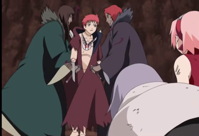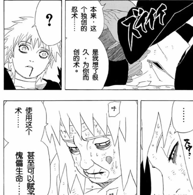 当蝎看到千代婆婆驾驭的傀儡围绕在他两旁时,本不错避让的他,却晃了神而被捅穿腹黑。