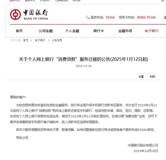 12月18日,中国银行发布公告称,为给客户提供愈加丰富和优质的金融劳动,中国银即将全面升级手机银行贷款专区劳动,并主义于2025年1月12日起将个东说念主网上银行“消耗贷款”筹商线上劳动挪动至手机银行,包括贷款肯求、面谈、签约、支款、还款等。