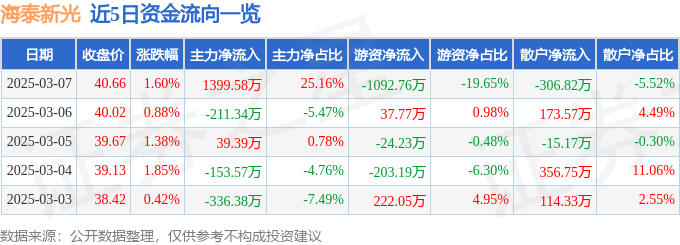 本站音信,狂放2025年3月7日收盘,海泰新光(688677)报收于40.66元,高潮1.6%,换手率1.15%,成交量1.38万手,成交额5561.66万元。