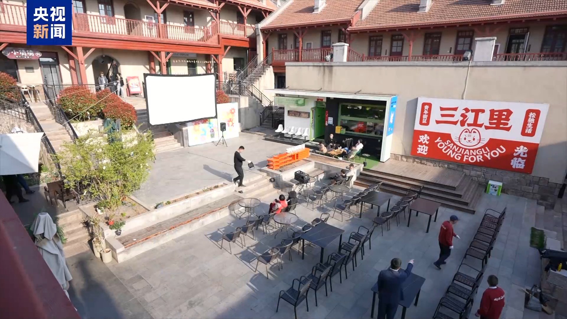 傍晚,两位主播在三江里汇合,在露天的里院,为40多名不雅众放映了电影。