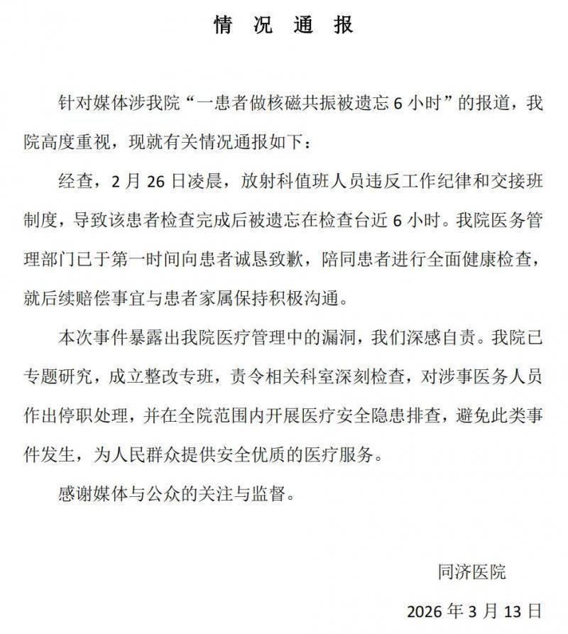 经查,2月26日凌晨,辐射科值班东谈主员违背责任纪律和交交班轨制,导致该患者查验完成后被淡忘在查验台近6小时。我院医务处分部门已于第一工夫向患者敦厚致歉,陪伴患者进行全面健康查验,就后续补偿事宜与患者家属保执积极调换。