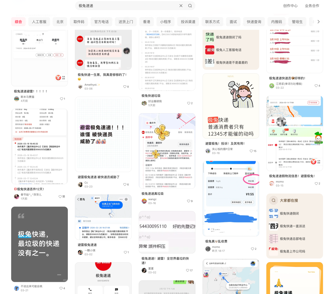 在小红书等酬酢平台上检索“极兔速递”关节词,不错发现大齐来自虚耗者的投诉。这些投诉高度归拢在“结尾事迹”活动,“未经允许将包裹扔在驿站或家门口”“快递员气魄恶劣”“包裹禁锢遗失”“客服处理滞后”等问题屡见不鲜。
