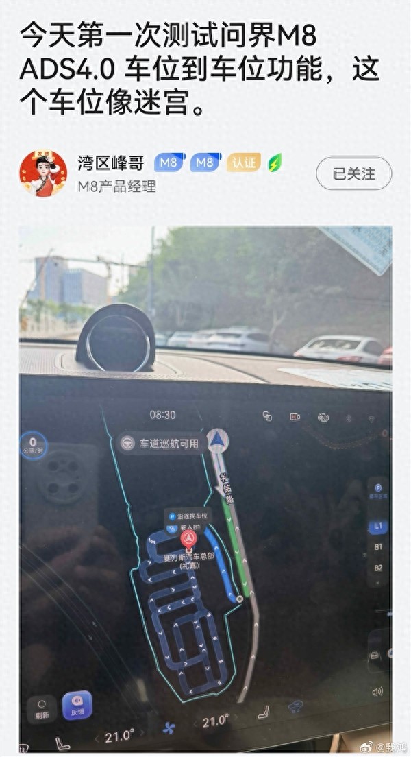 6 月 29 日音信,博主 @我鸿 昨日共享了问界 M8 产物司理 @湾区峰哥 在鸿蒙智行 App 中发布的帖子。该贴提到,问界 M8 汽车正在测试 ADS 4.0 车位到车位功能。