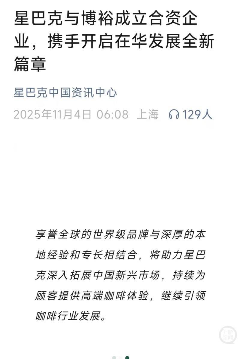 星巴克中国发布音问“星巴克与博裕成本栽培结伴企业”。 图据星巴克中国官微